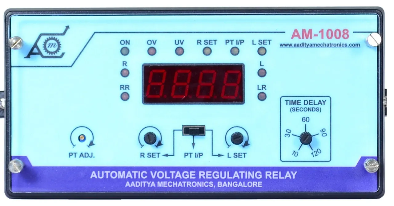 This is an automatic voltage regulating relay with microcontroller based architecture. Settings are made through front provided trim-pots and all data is stored in nvram. Built-in PT adjustment is also provided for precise measurement and control of PT voltage.